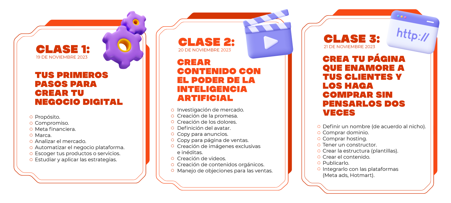 Descubre en vivo durante 7 días, desde el domingo 19 de Noviembre al sábado 25 de Noviembre el plan exacto que te llevará de la mano a construir tu negocio online, sin que tengas experiencia y sin importar tu edad o profesión.